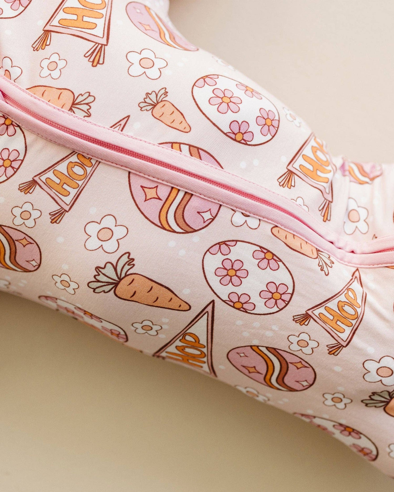 Say hello to Easter with our Bamboo Zip Romper in an Easter Hop design! Featuring an adorable print of pastel flowers, carrots, and playful eggs, this romper is as cute as it is comfortable. Made from a buttery-soft bamboo fabric blend, it’s gentle on sensitive skin, ensuring your little one stays cozy during every hop, skip, and jump. With built-in mittens and footies for added convenience, it's perfect for all-day wear, whether your little one is exploring or napping.