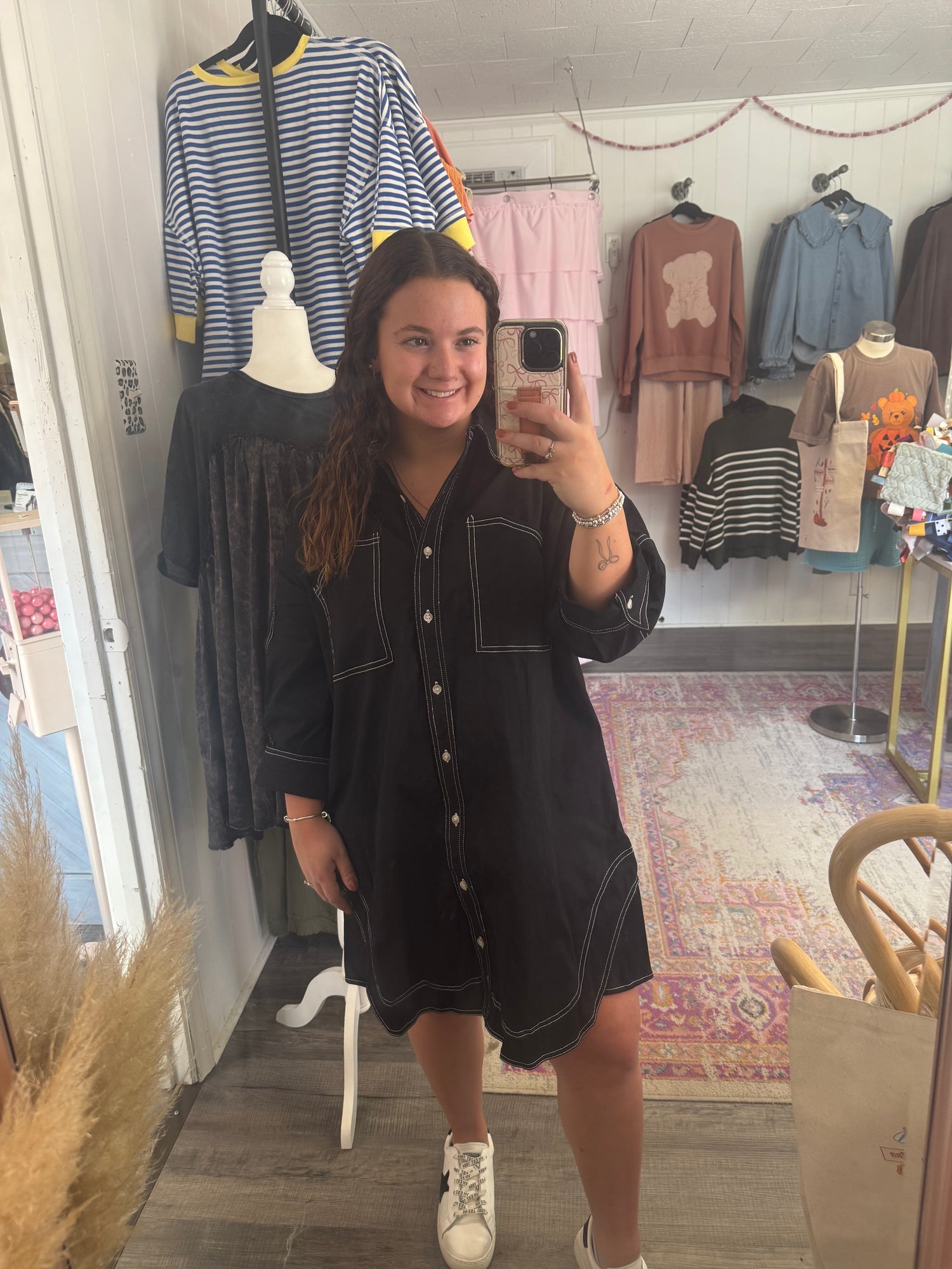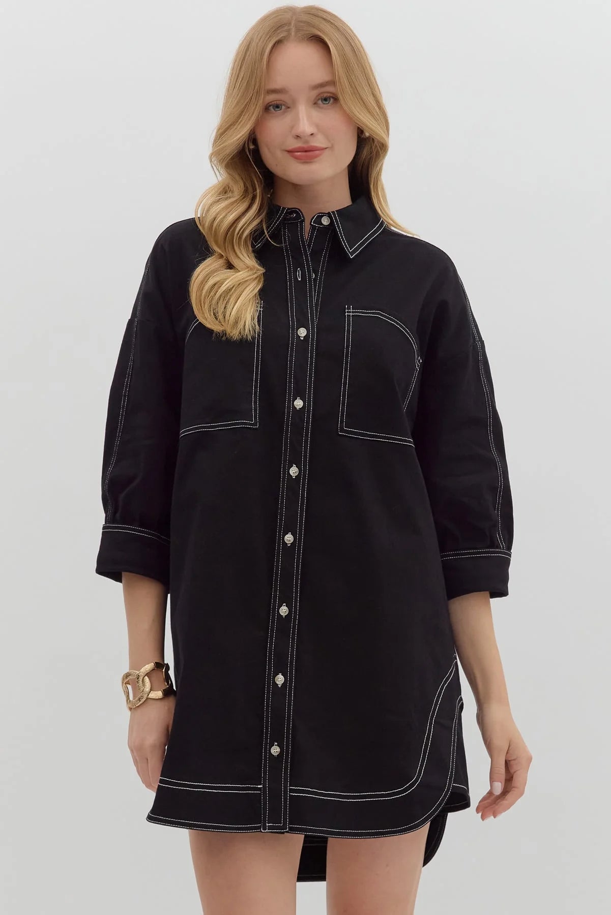 This black long sleeve denim dress features precise white stitching that highlights its tailored design. Its short length offers a modern, versatile silhouette suitable for both casual and more polished looks. Crafted from durable denim, it combines comfort with lasting style, making it a practical yet chic addition to your wardrobe.