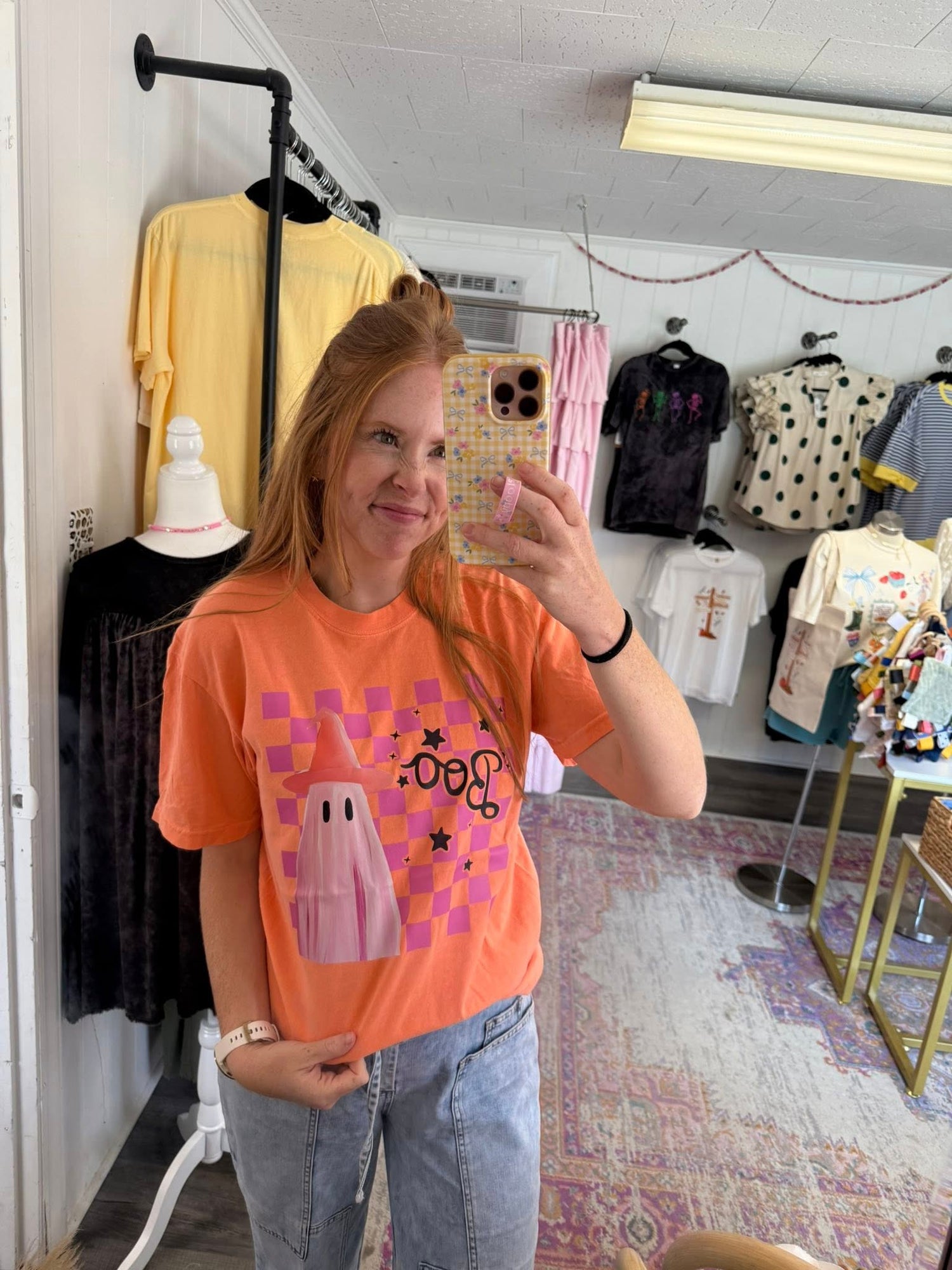 Bright, playful, and just the right amount of spooky-cute, this Comfort Colors tee is perfect for all your fall festivities. Featuring vibrant pink and orange checkerboard patterns, a whimsical ghost in a witchy hat, and a playful "Boo!" graphic—it’s your must-have tee for pumpkin patch strolls, cozy bonfire nights, and all your spooky-season adventures!