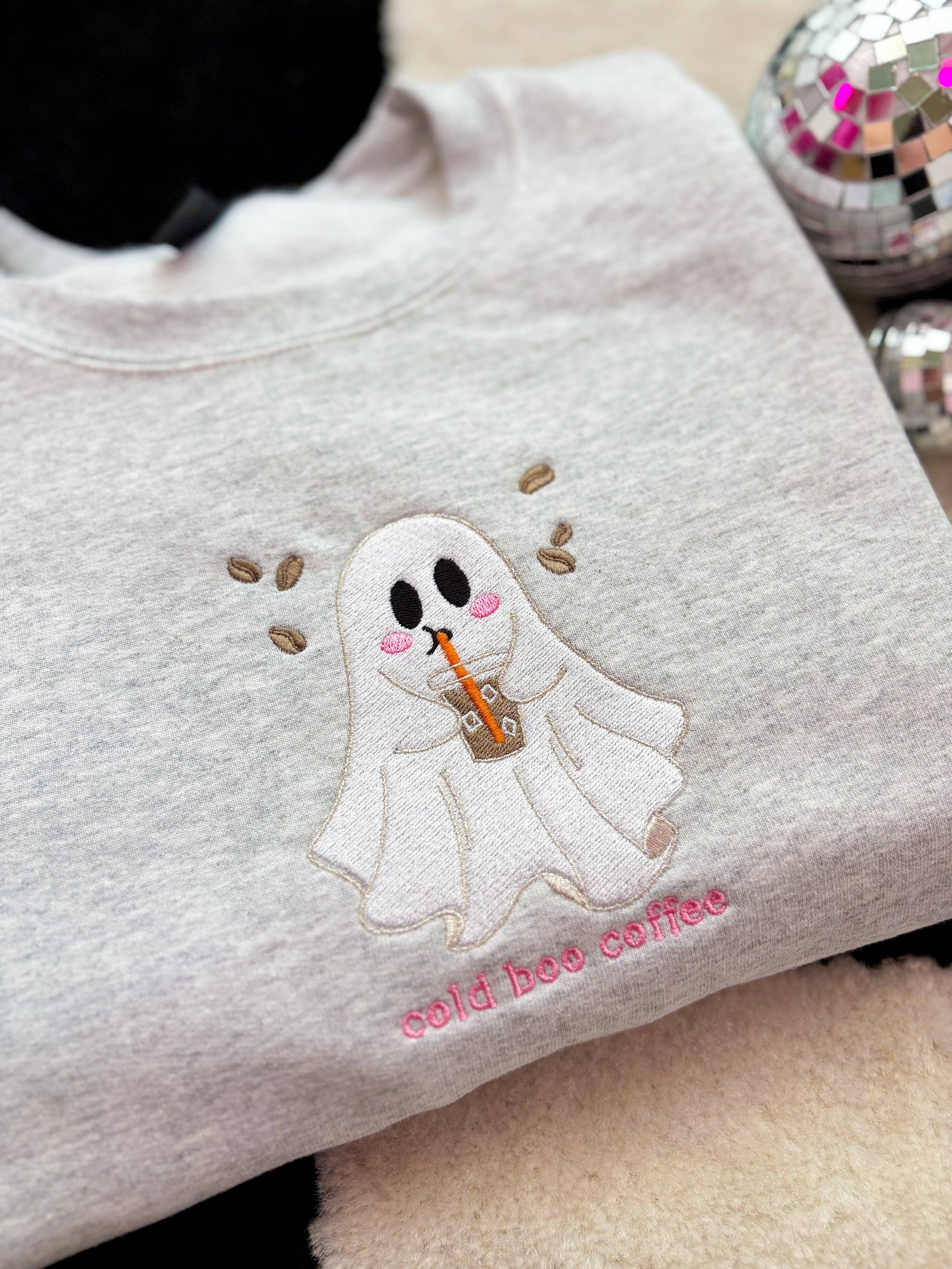 Coffee Lover Gift Cozy meets spooky-cute in our Cold Boo Embroidered Crewneck! Featuring a ghost sipping iced coffee with embroidered coffee bean details, this ash gray sweatshirt is perfect for fall, Halloween, and coffee lovers. Made with premium embroidery on a unisex Gildan crewneck, it’s soft, durable, and perfect for boutiques looking for seasonal statement pieces.