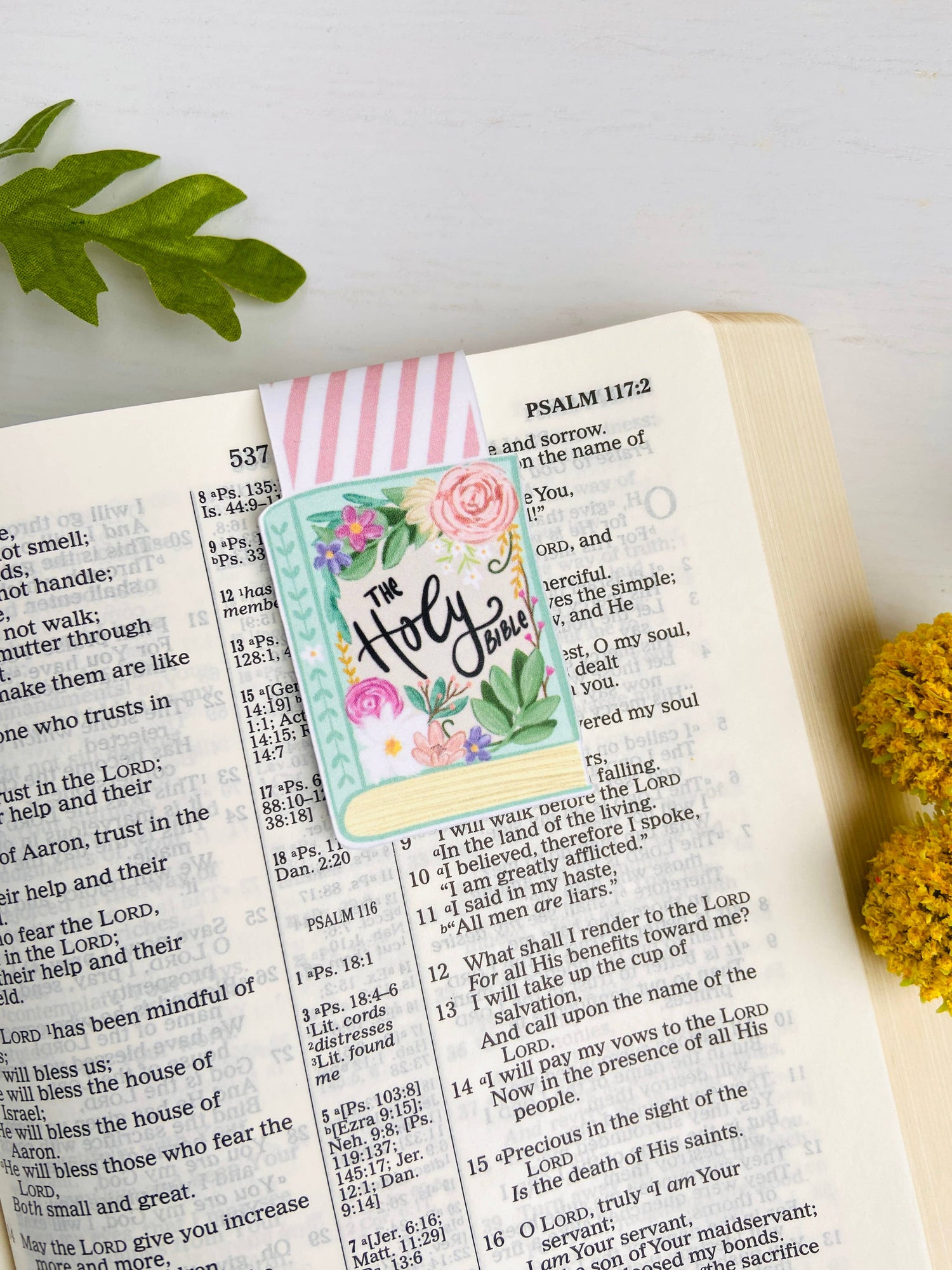 Beautiful Holy Bible magnetic bookmark! Boho illustrated flowers and hand lettered script adorn this mini book! This double-side, magnetic bookmark makes it a thoughtful gift for book lovers!