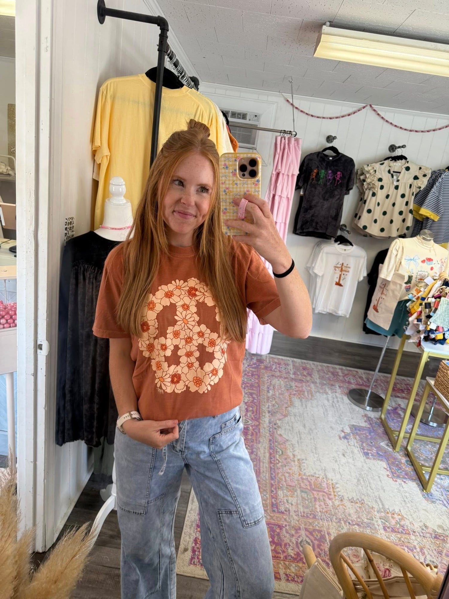 Get ready to spread good vibes with our Peace Flower Tee! Designed in cozy yam color comfort colors, this tee features a floral peace sign for a touch of boho style. Perfect for fall and everyday wear, it's comfy and effortlessly cool. Unleash your inner flower child with this whimsical tee!