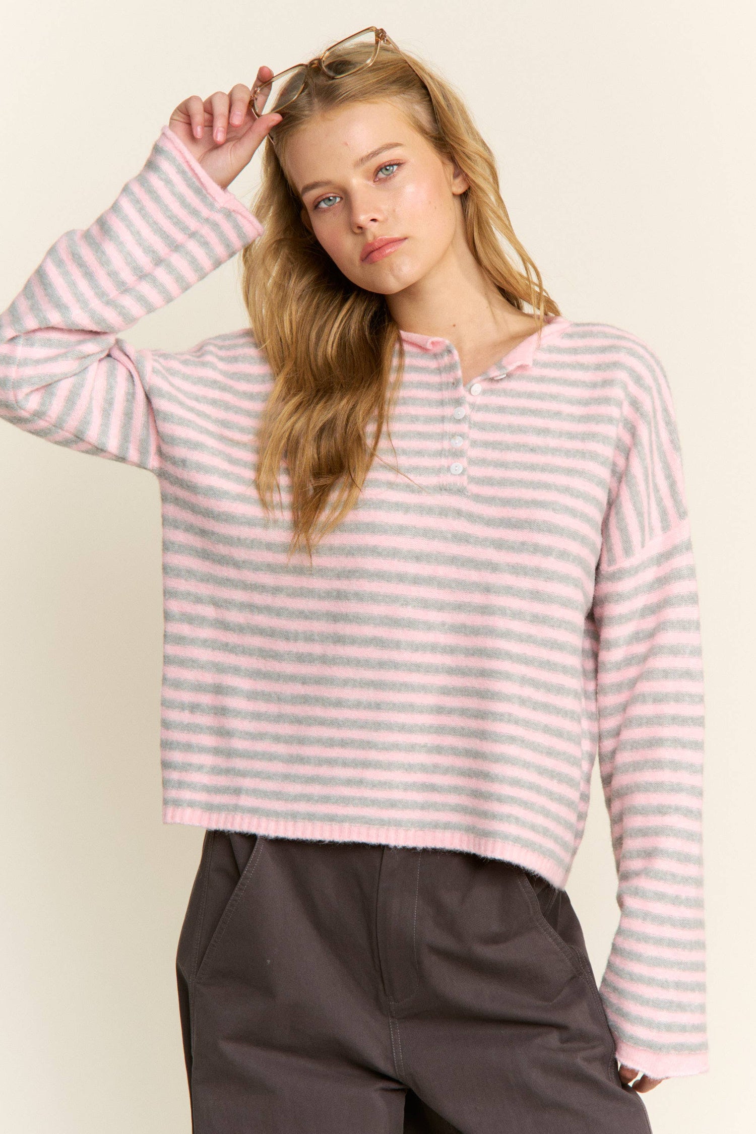 Snuggle into this delightful striped pullover that's all about easy elegance! With soft horizontal stripes in pink and grey, a charming Henley neckline featuring button details, and those oh-so-comfy drop shoulders, it's designed for laid-back vibes. The cropped silhouette makes it a layering dream or a standalone stunner!
