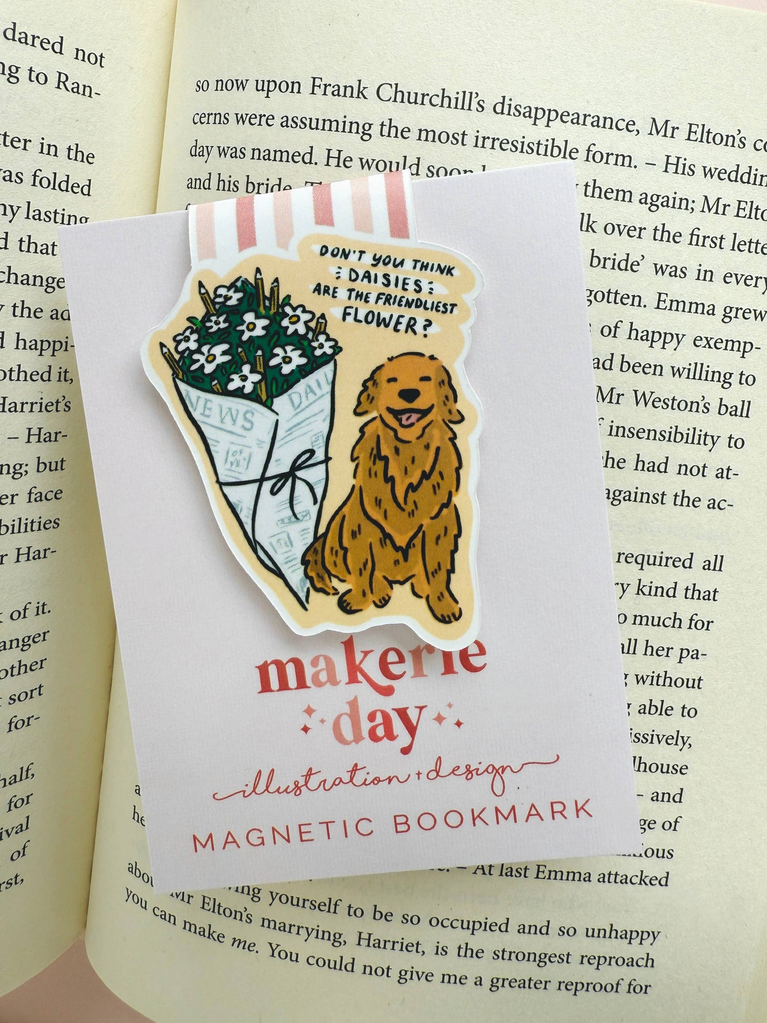 Introducing our You've Got Mail inspired magnetic bookmark! This double-side, magnetic bookmark features an whimsical illustrated design, making it a thoughtful gift for book and movie lovers! Features "Brinkley" and bouquet of daisies and pencils. Words have been updated to say "Don't you think daisies are the friendliest flower?"